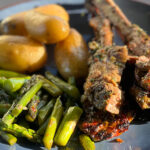 Drei bis Vier Kartoffeln, etwas grüner Spargel und die Lamm Tomahawks auf einen Teller anrichten und genießen.