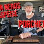 Jetzt wird der Knoblauch und die Kräutermischung in den Schweinebauch verteilt und anschließend wird der Schweinebauch zusammen gerollt. Darauf Achten, das die Schwarte außen ist. Alles mit dem Metzgergarn zusammen binden und aufspießen.